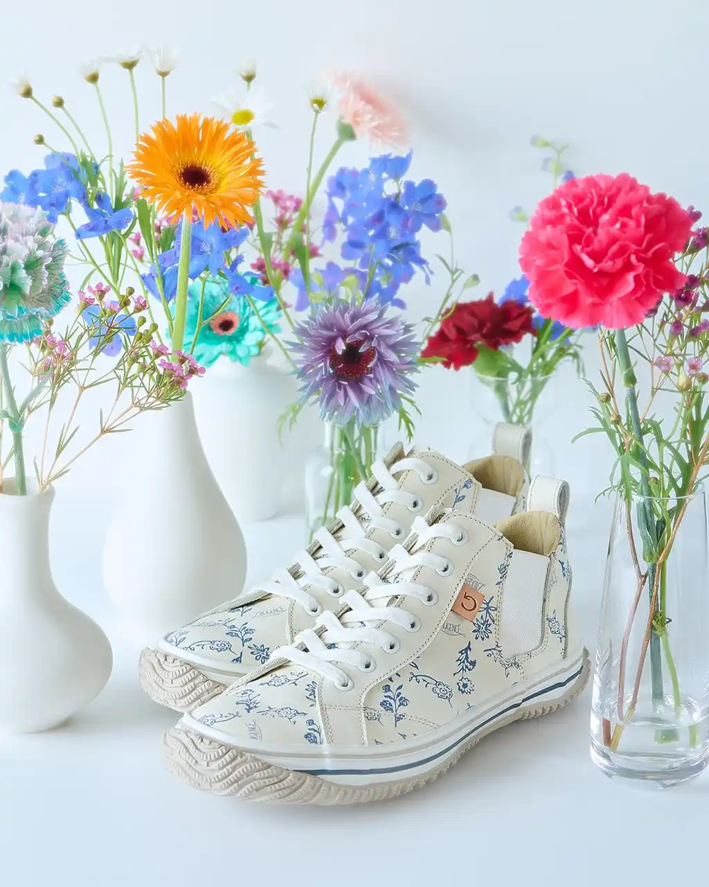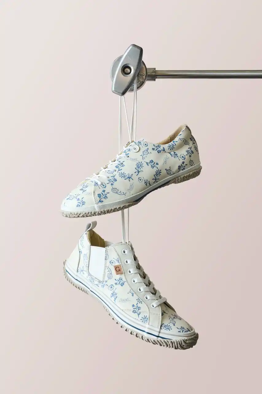 PARLOURのロゴも一緒に忍ばせたオリジナルパターンを作成。アンティークの花瓶をモチーフにしたカラーリングでカウレザーにプリント、SPINGLEのスニーカーに落とし込みました。今回、「母の日」に花を贈るようにコラボスニーカーを贈ることで日頃の感謝の気持ちを大切な人に伝えるだけでなく、「歩く喜び」を感じて欲しいという想いも込めています。 |