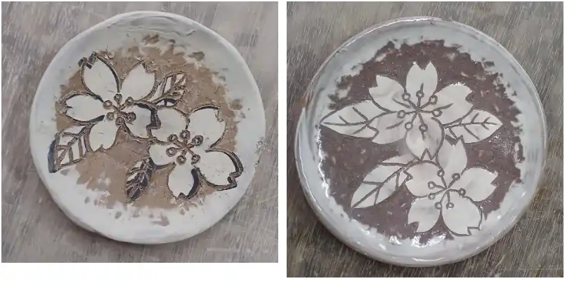 「掻きおとし」とは、成形した器の表面に異なる色の化粧土を塗り、それを削り取ることで下の土の色を出し、模様を浮かび上がらせる技法です。 |