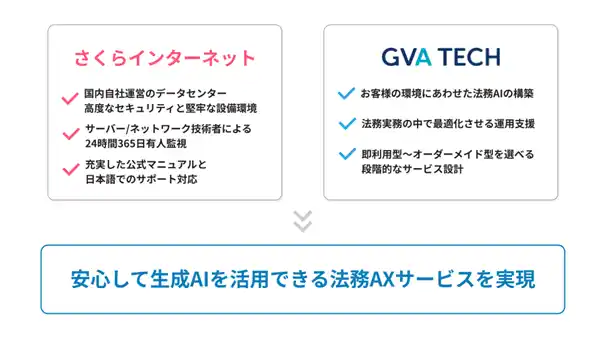 こうした課題を解決するため、GVA TECHとさくらインターネットは本契約を締結し、さくらインターネットの国内データセンターで完結するインフラ基盤上で、安心して生成AIの性能を最大限活用できる法務AXサービスを提供することといたしました。 |