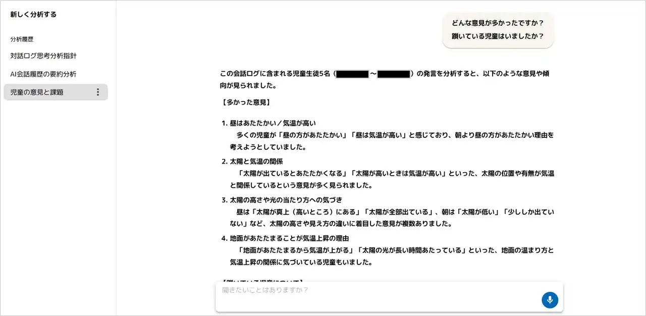 「チャッともシンク」では、これまでも児童生徒と生成AIの対話履歴を教員が確認することが可能でしたが、新たに搭載する「対話ログ分析」では、対話履歴を生成AIが分析することで、「何について考えているか」「どのように思考が進んでいるか」といった観点や方向性を整理してリアルタイムで提示します。これにより、教員は個々の児童生徒の理解度や検討の過程でのつまずきなどをより正確に把握することが可能になります。次回に向けた課題の再設計や指導方法の見直しに役立つだけでなく、児童生徒一人ひとりの学びのプロセスを踏まえた適切な評価にもつながります。 |