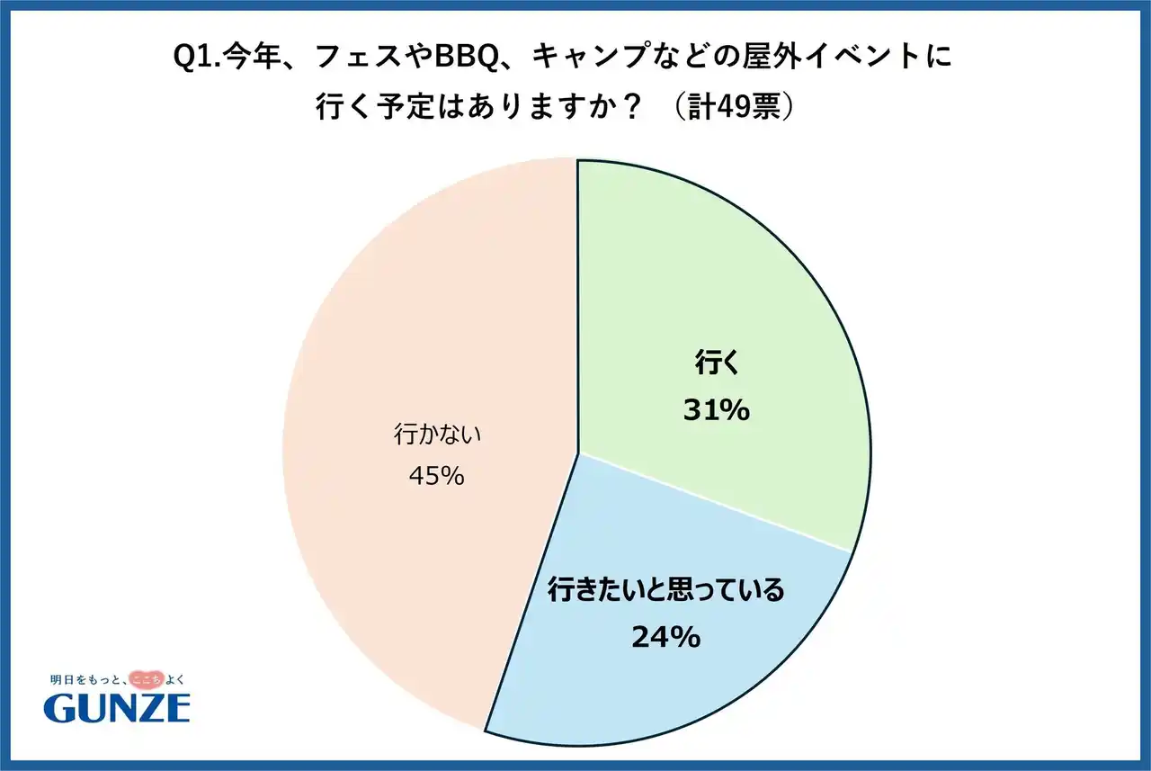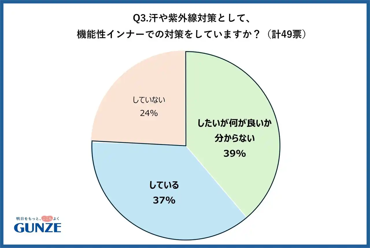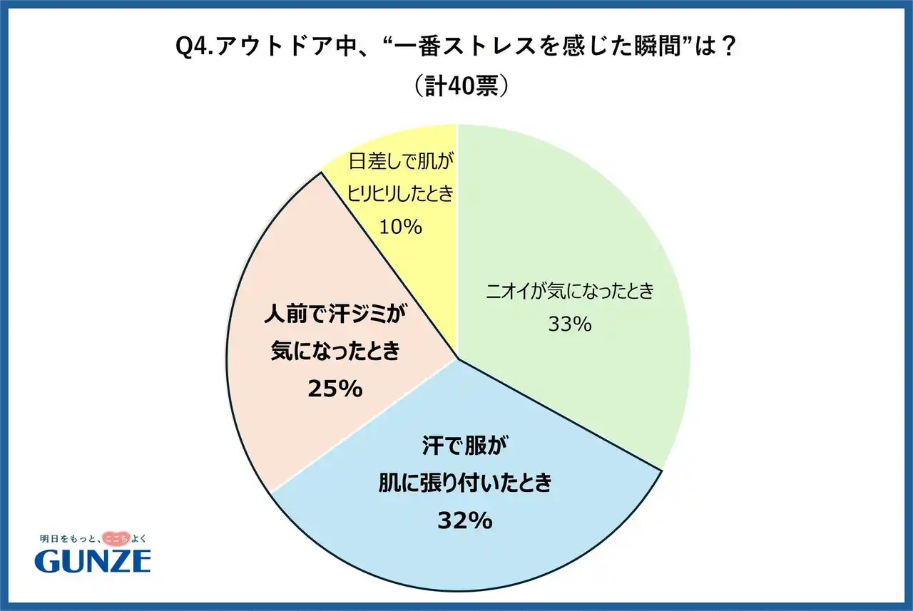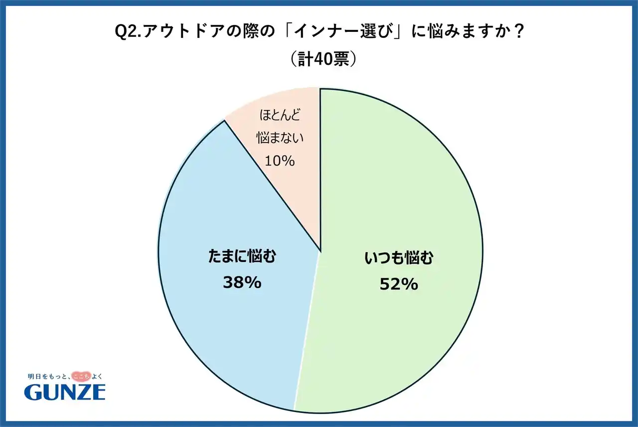 グンゼの公式Instagramを活用し、アウトドアとインナーに関するアンケート調査を実施しました。フェスやBBQなどのアウトドアの際、インナー選びに「いつも悩んでいる」「たまに悩む」と答えた方は90%と、選び方の難しさが明らかになりました。また、汗や紫外線対策として機能性インナーで対策をしている、したいと回答した方は76%にのぼり、アウトドアシーンの快適性を左右する要素として、インナーへの関心の高さがうかがえました。また、汗はアウトドア中にストレスを感じる要因となっており、57%の人が汗による不快を感じていました。 |