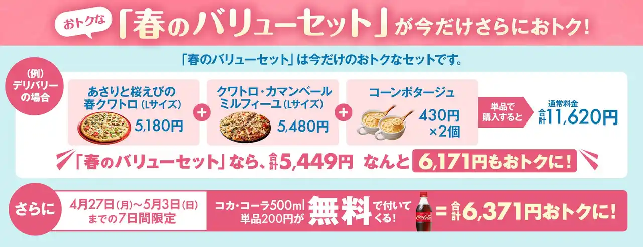 株式会社ドミノ・ピザ ジャパン(代表取締役兼CEO:ディーター・ハーベル、本社:東京都品川区、以下:ドミノ・ピザ)が展開する国内No.1シェアを誇る宅配ピザチェーン ドミノ・ピザは、2026年4月27日(月)~5月3日(日)までの7日間限定で、「春のバリューセット」をご注文いただいた方に、コカ・コーラ500ml1本を無料でプレゼントするキャンペーンを実施いたします。