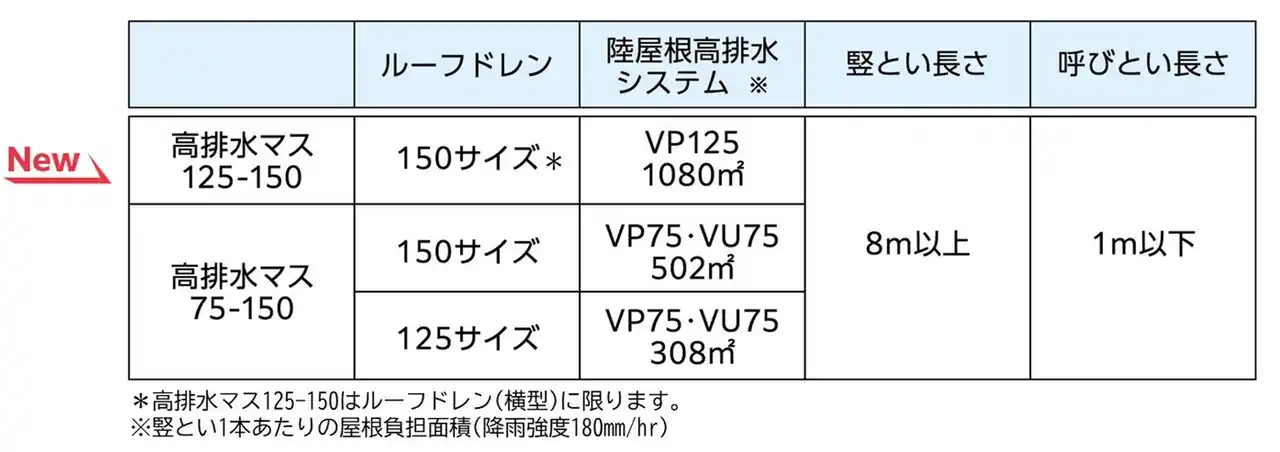 これまでの陸屋根高排水システムの『高排水マス75-150』では、概ね屋根面積が5,000平方メートル 未満の対応となっていましたが、昨今、大規模物流施設やデータセンターなども急増しており、『高排水マス』にさらなる大容量タイプが求められていました。 |