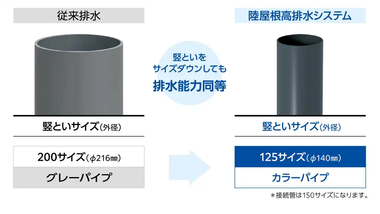 125サイズで200サイズと同等の排水能力を発揮します。これにより200サイズ(口径φ216対応)の竪といを125サイズ(口径φ140対応)に変更でき、建物の外観をすっきりすることができます。 |