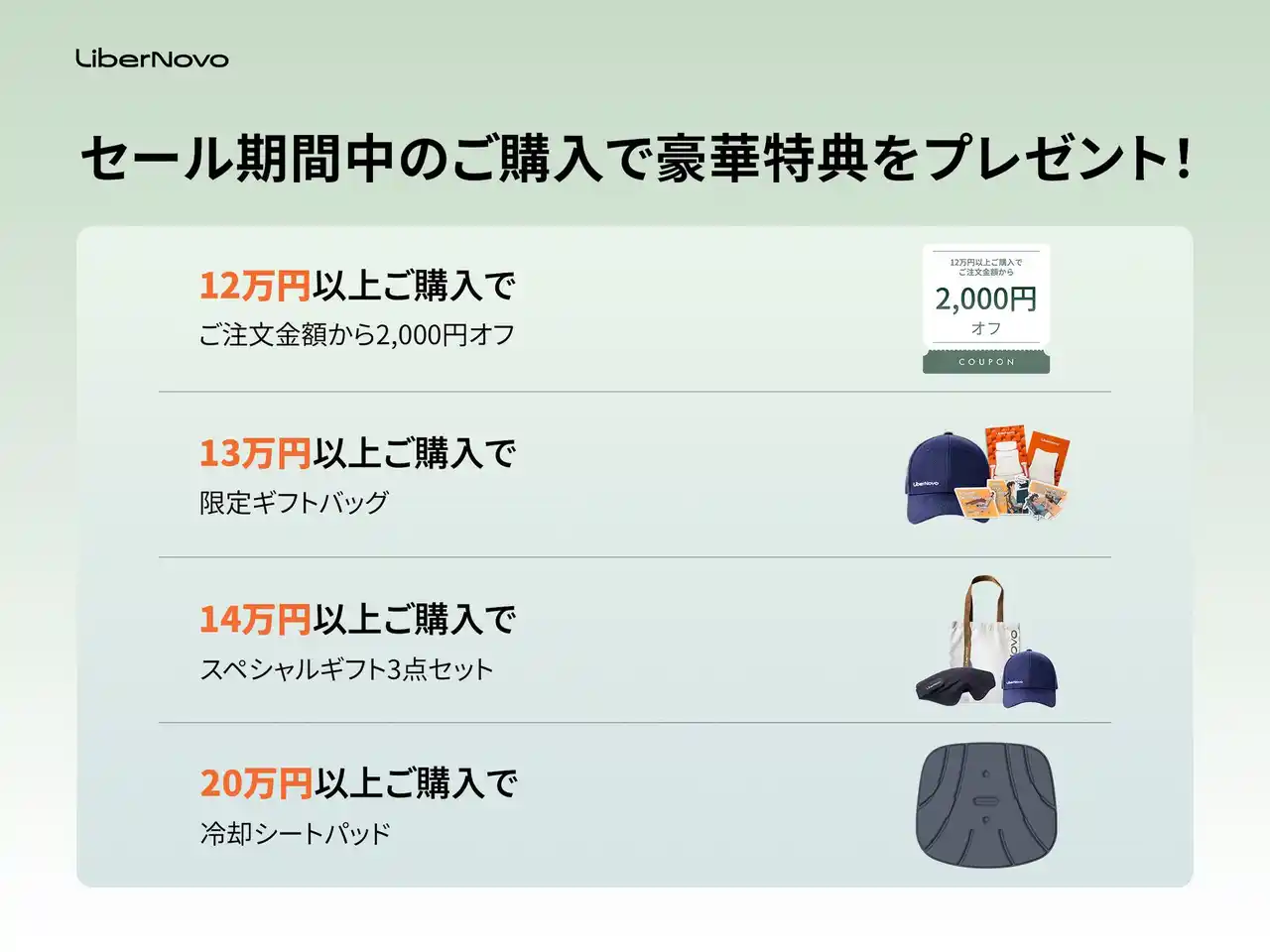 特典 1:12万円以上ご購入でご注文金額から2,000円オフ 特典 2:13万円以上ご購入で「限定ギフトバッグ」プレゼント(オリジナルマグネット、キャップ、付箋) 特典 3:14万円以上ご購入で「スペシャルギフト3点セット」プレゼント(キャンバストート、アイマスク、キャップ) 特典 4:20万円以上ご購入で「LiberNovo 冷却シートパッド」プレゼント |