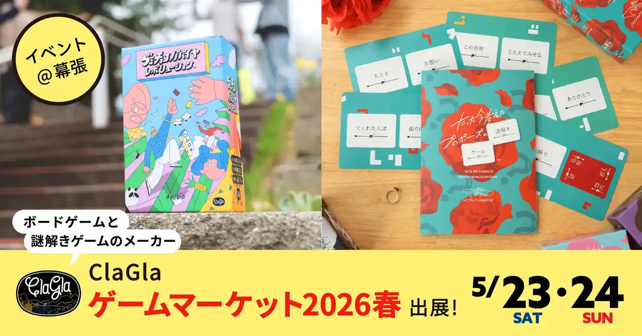 | ClaGlaが幕張メッセで行われる「ゲームマーケット2026春」に出展します。新作のボードゲームや謎解きゲームをイベント価格で販売いたします。 |