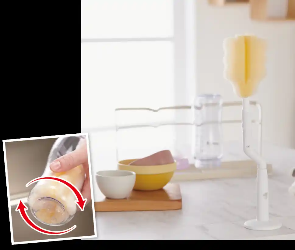 「\広口ほ乳びんのための/取り替えができる ほ乳びん洗い」のヘッドと互換性があり、柄だけ回転式にしたいときなど、シーンに合わせて使い分けできます。 |