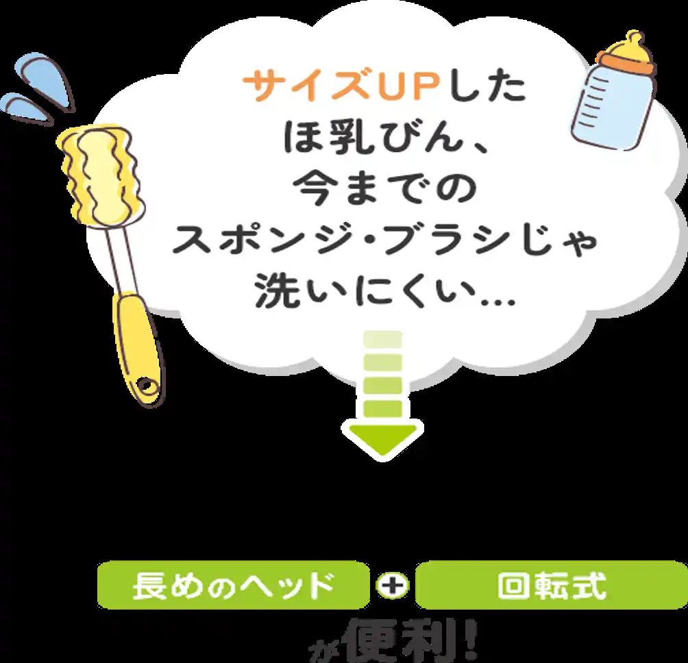 そんな課題を解決するために、ヘッドを長めにすることで底まで届きやすく、回転式にすることで力を加えなくともスピーディーに汚れを落とすことができるほ乳びん洗いスポンジを開発しました。 |