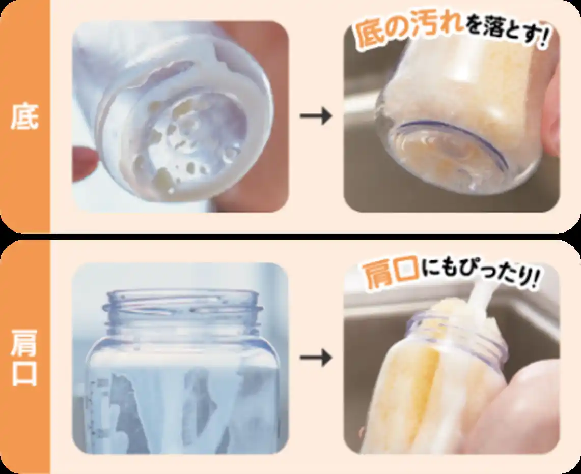 スポンジの大きさや形状は、広口ほ乳びんに合わせた設計なので、底や肩口などミルク汚れがたまりやすい場所にもフィットし、少ない力できれいに洗えます。 |