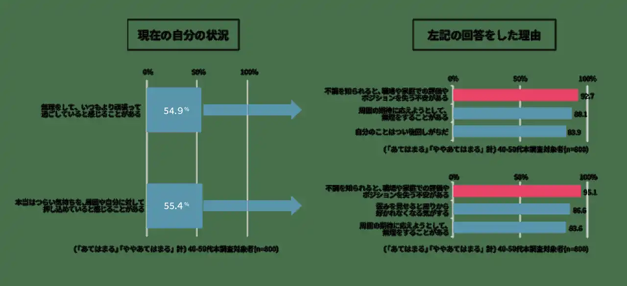 現在の自身の状況について、半数以上の女性は「無理をして、いつもより頑張って過ごしていると感じることがある」(54.9%)、「本当はつらい気持ちを、周囲や自分に対して押し込めていると感じることがある」(55.4%)、と回答しました。その理由の第一位に共通して挙げられた回答は、「不調を知られると、仕事や家庭での評価やポジションを失う不安がある」(「無理をして、いつもより頑張って過ごしていると感じることがある」:92.7%、「本当はつらい気持ちを、周囲や自分に対して押し込めていると感じることがある」95.1%)となっており、90%以上の女性が仕事や家庭に不調を知られることへの影響を不安視していることが明らかになりました。 |
