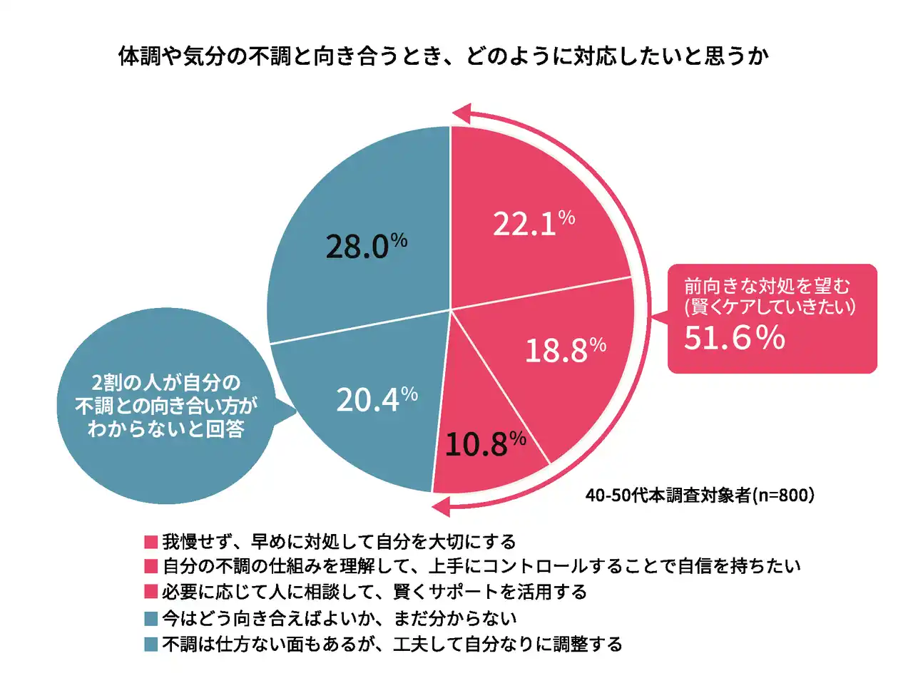 51.6%の女性は「体調や気分の不調に前向きに対処したい」と回答 |
