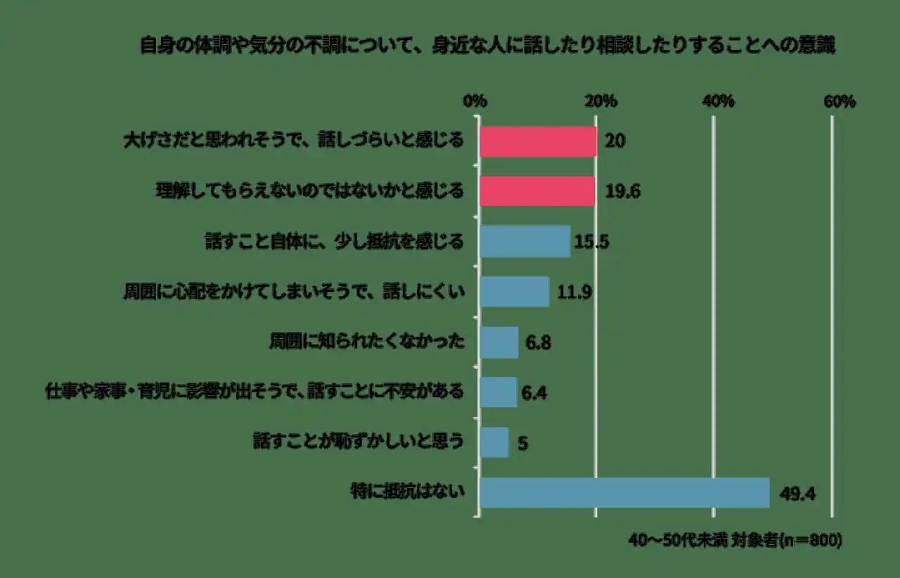 不調を周囲に相談することに対し、大げさだと思われそうで話しづらい」(20.0%)や「理解してもらえないのではないか」(19.6%)という周囲の目を不安視 |
