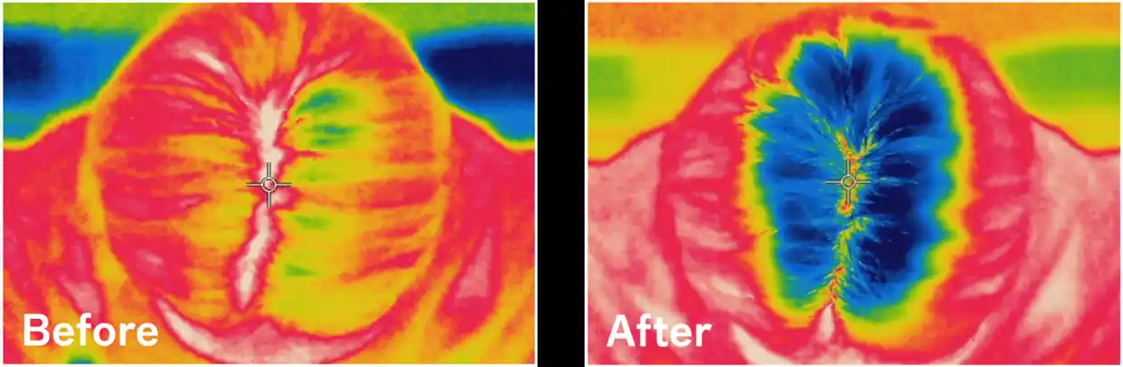 夏を想定した30℃/60%加湿の環境下で、頭皮に塗布した状態をサーモグラフィーカメラで測定したデータ |
