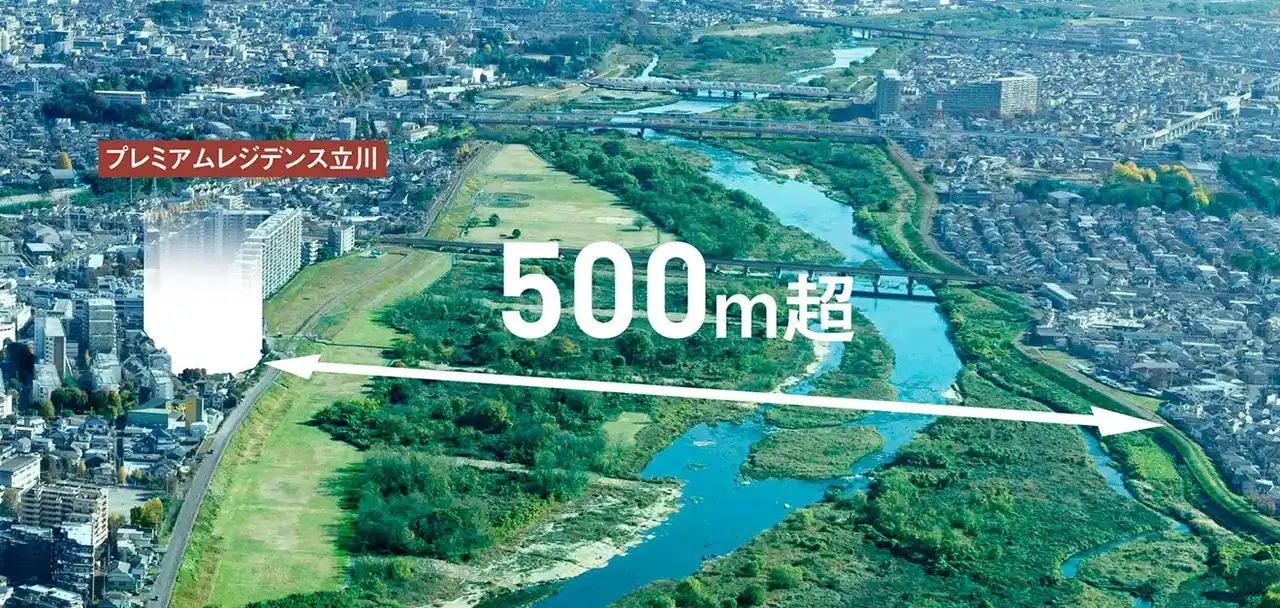 本プロジェクトは、多彩な商業店舗が集積する立川エリアでありながらリバーフロントの最前列という、都市利便性と水辺に代表される自然環境を兼ね備えた希少な立地に誕生します。 敷地南側に広がる多摩川の河川敷は対岸まで約500mにわたり視界を遮る建物が無く、開放感あふれる眺望を享受できるロケーションとなります。 |