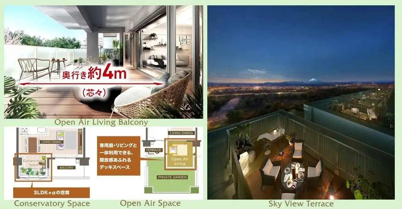 専有部は、1都3県および立川市で供給されている新築分譲マンションの平均面積を超える73平方メートル 超の広さを確保。2面をガラスに囲まれたコンサバトリースペースや奥行き4mのバルコニー、屋上テラスや専用駐車場付きの1階住戸など、個性豊かで多彩なプランを展開します。 |