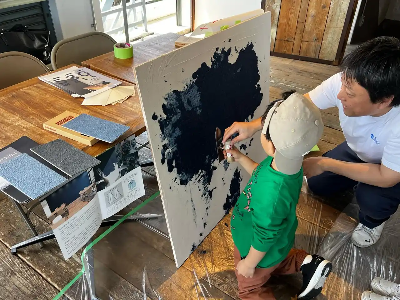 「体験者の9割が左官初体験でしたが、お子様と一緒に親御さんも楽しんでいただけました。デニムの端材からできている左官材だと伝えると驚きの声が上がり、実際に自分の家で使いたいという声もいただくなど、非常に手応えを感じました。左官に触れてもらうだけでなく、廃材が価値あるものとして再利用できるという発見をしていただける、素晴らしい機会になったと感じています」 |