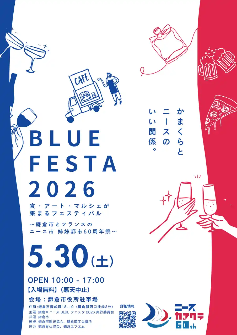 鎌倉市とフランス・ニース市の姉妹都市提携60周年を記念し、食・アート・マルシェが集まるフェスティバル~鎌倉市とフランスのニース市 姉妹都市60周年祭~「BLUE FESTA 2026」を2026年5月30日(土)、鎌倉市役所 駐車場広場にて開催いたします。 本イベントは、“海(BLUE)”をテーマに、食・アート・環境・文化を横断しながら、両都市の魅力を体験的に楽しむ交流イベントです。当日は、鎌倉発の飲食店によるフレンチや日本食、南フランスをイメージしたマルシェ、アート体験やステージプログラムなど、多彩なコンテンツを通じて文化交流を体感いただけます。 |