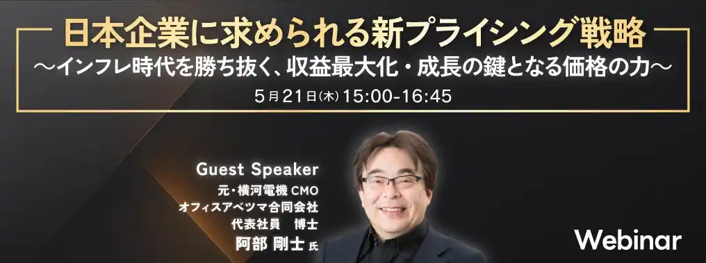 本セミナーでは、横河電機にてマーケティング改革に取り組まれ、企業価値向上や先駆的な組織デザインを主導されてきた 元・横河電機CMO 阿部 剛士氏をお招きし、日本企業が直面する価格戦略の課題を明らかにし、収益最大化を実現するための“価格支配力”の醸成ポイントについてご講演いただきます。 |