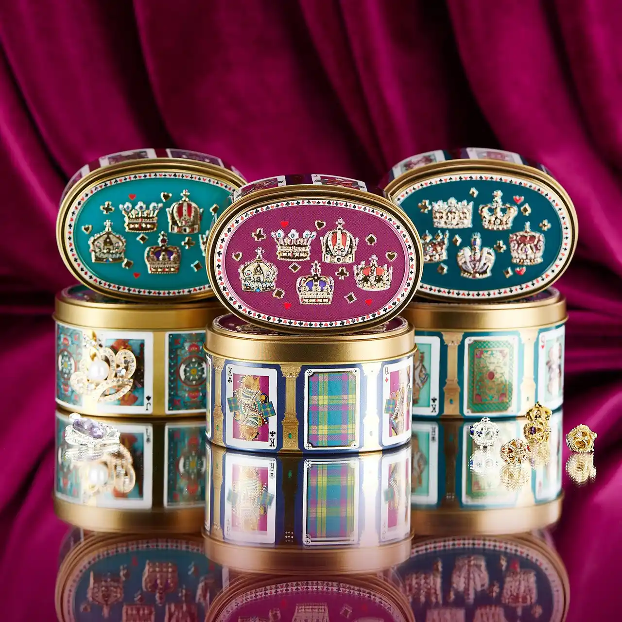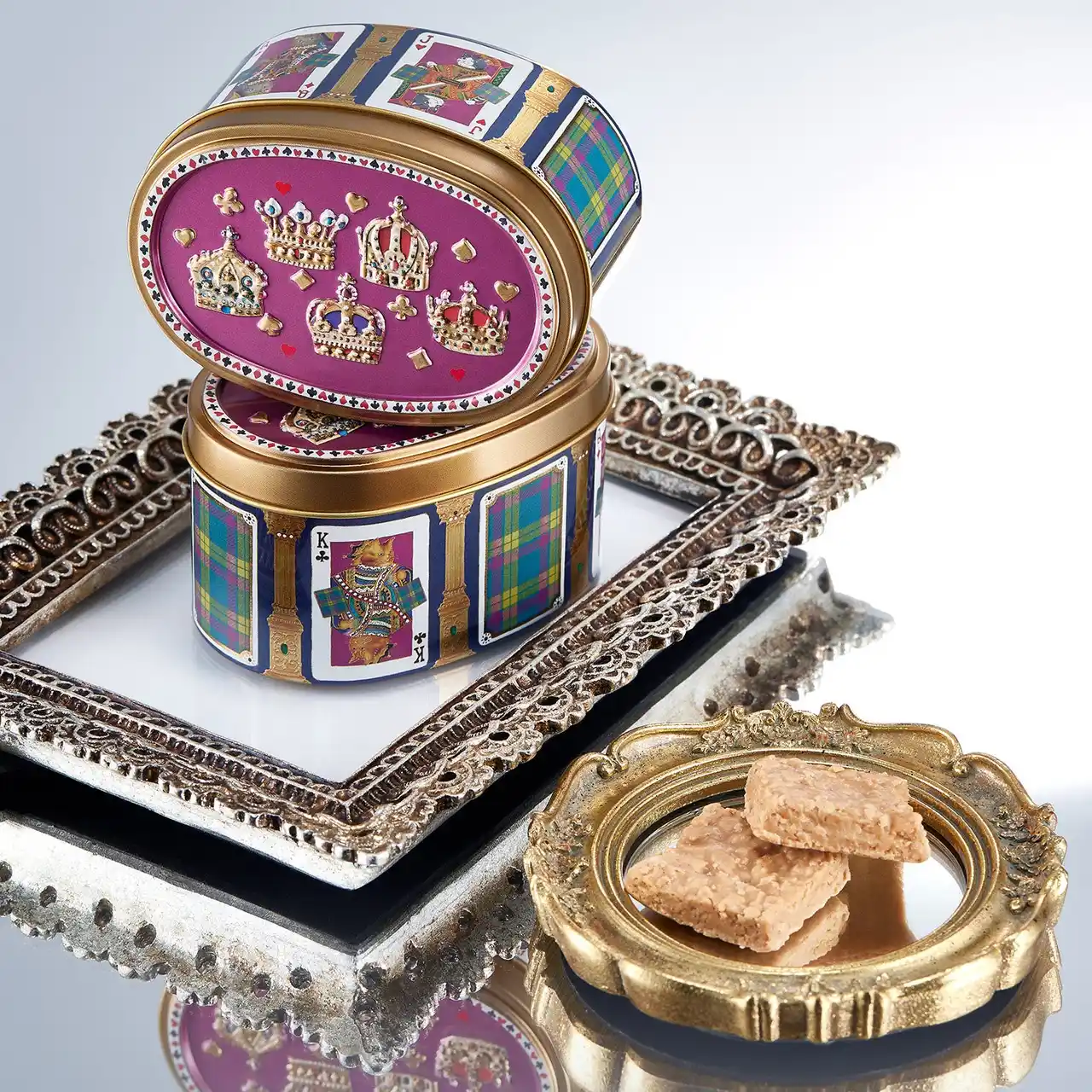 伊勢丹といえば、紙袋でもお馴染みのマクミラン柄。缶の側面にマクミラン柄のトランプをデザインしました。蓋面の王冠デザインの背景色は、伊勢丹の紙袋の取っ手の色をイメージしました。 |