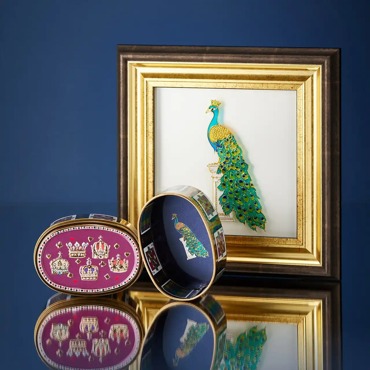 缶内側の底面には、伊勢丹新宿店本館の正面玄関レリーフにも描かれており、伊勢丹のシンボルである『孔雀』をイメージしたガラス絵を施しました。伊勢丹ファン必見の隠し味です。 |