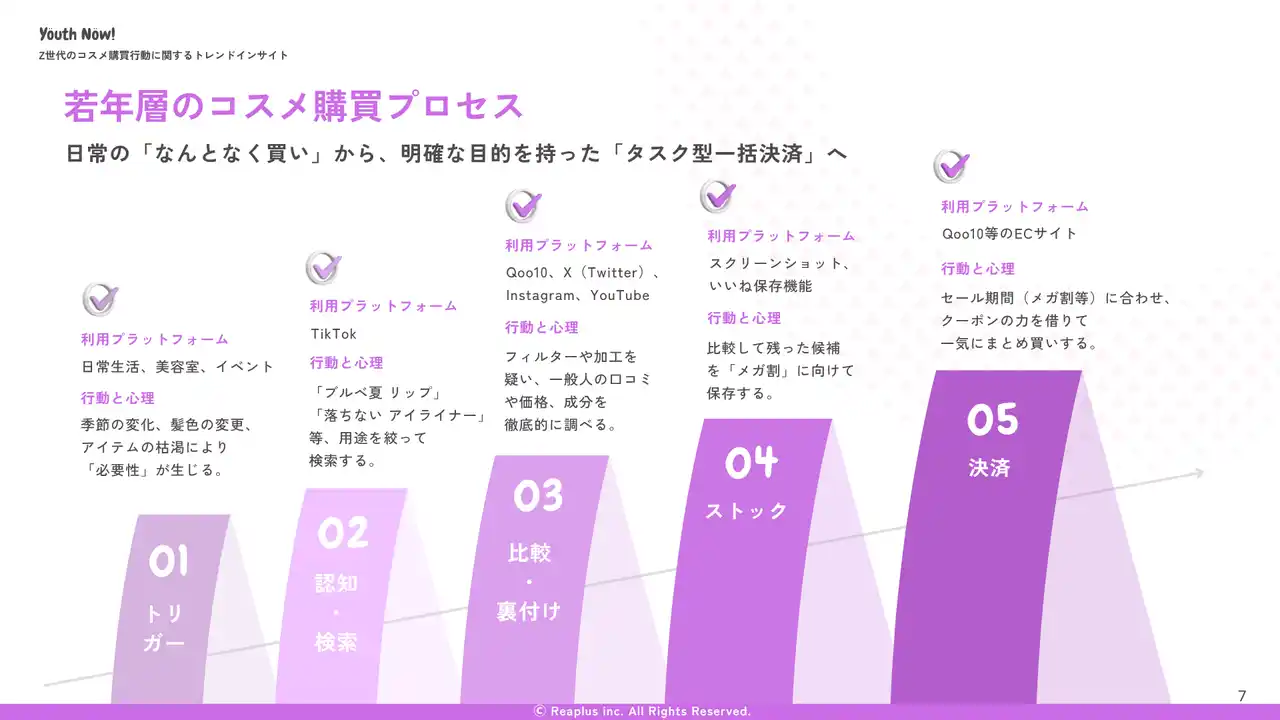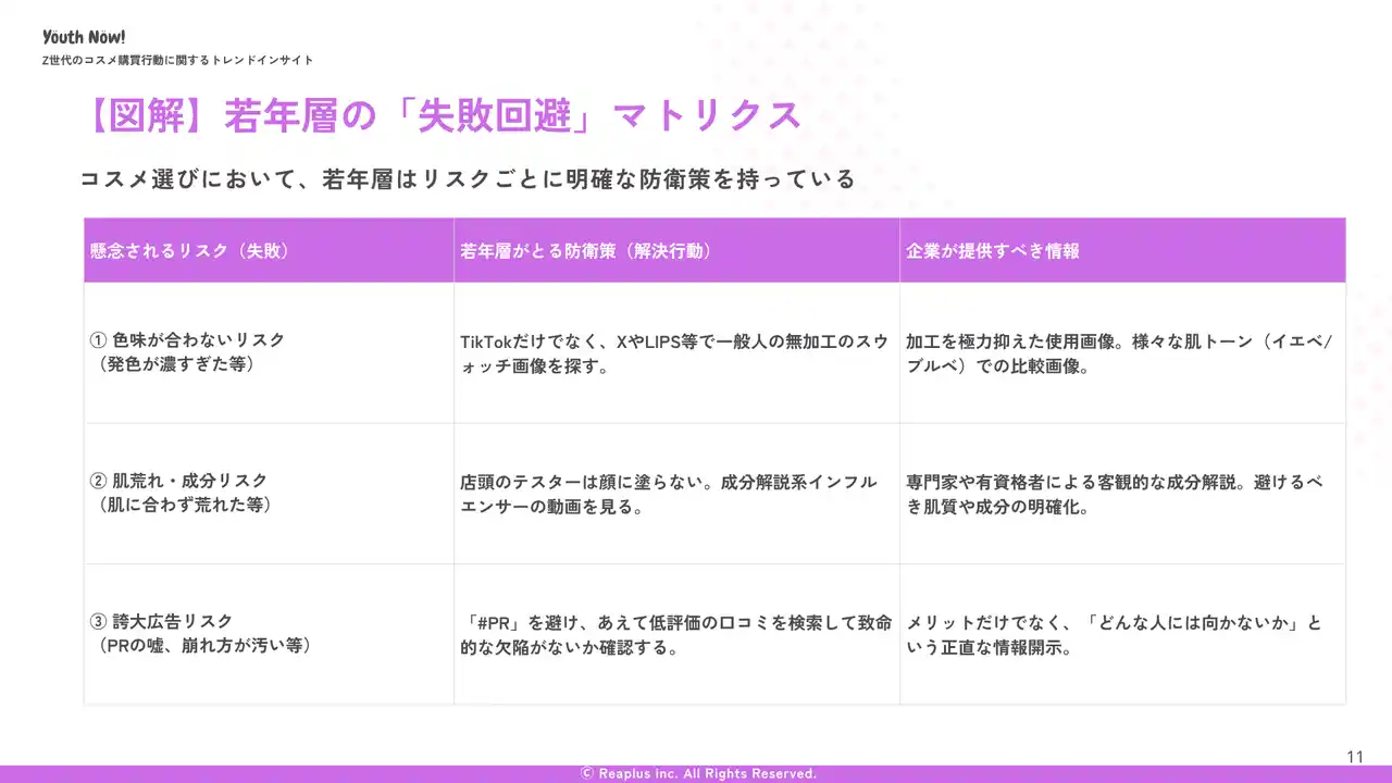 株式会社Reaplus[リアプラス](本社:東京都渋谷区、代表取締役:松元 詞音)は、若年層インサイトを可視化するマーケティングサービス「Youth Now!」にて、Z世代を対象に「コスメ購買行動に関する定性調査」を実施いたしました。 |