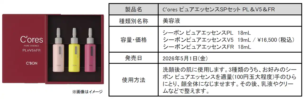 | 独自のビューティ・プログラム「ホームケア+サロンケア」を展開する株式会社シーボン(本社:東京都港区、代表取締役社長:崎山一弘、証券コード:4926)は、創業60周年の感謝の気持ちを込めて、濃密な3種の機能性美容液がうるおい・ハリ・艶肌へ導くスペシャルなホームケアセット「C’ores ピュアエッセンスSPセット PL&V5&FR 」を2026年5月1日(金)に数量限定で発売いたします。 | |||
