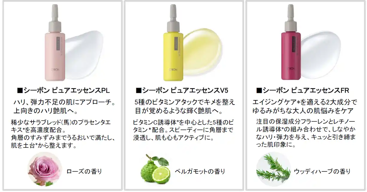 【株式会社シーボン】 濃密滴をダイレクトに。3種のピュアエッセンス「C’ores ピュアエッセンスSPセット PL&V5&FR」が登場