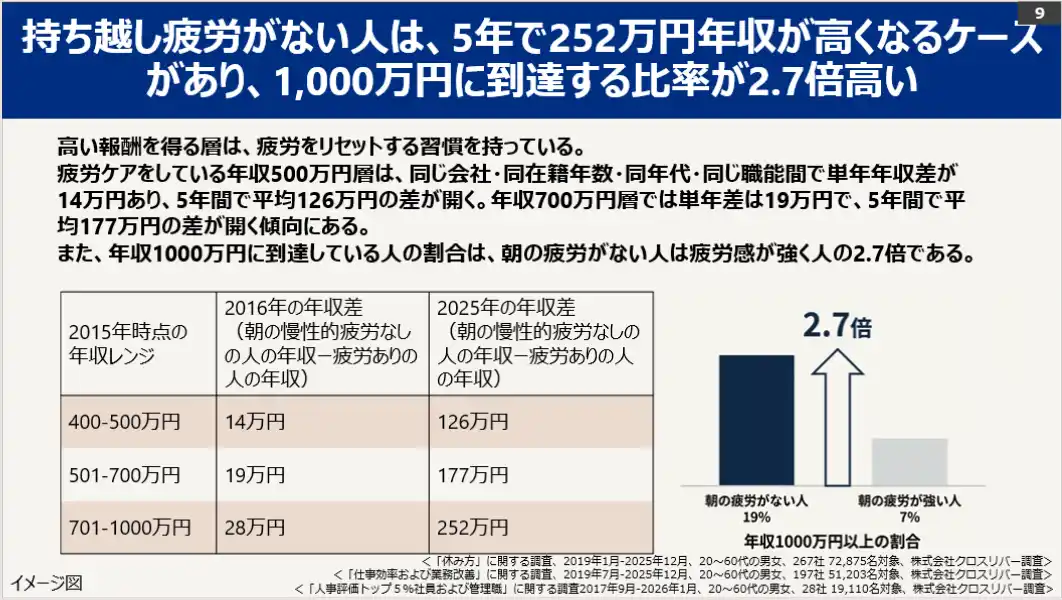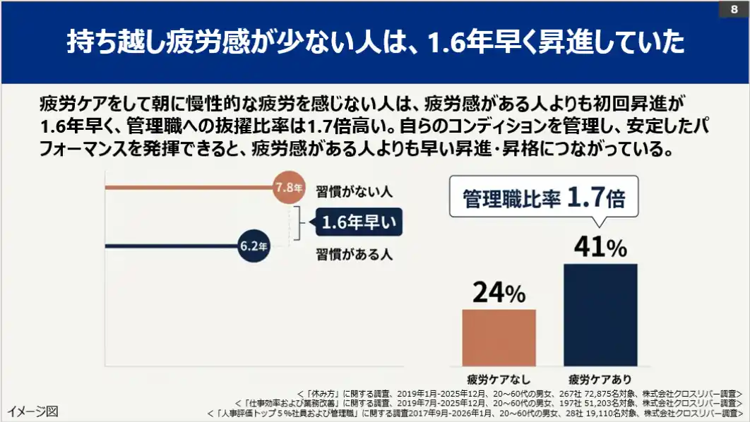 桜が咲き、新たな環境でのスタートに胸が膨らむ4月。しかし、意欲とは裏腹に、日々の疲れが抜けず前日の疲労を持ち越してしまう方は少なくありません。本調査では、こうした「朝の持ち越し疲労※注1」が、日々の集中力や残業時間だけでなく、昇進スピードや年収といった長期的なキャリアにまで深刻な影響を及ぼしている一面があることが明らかになりました。 |