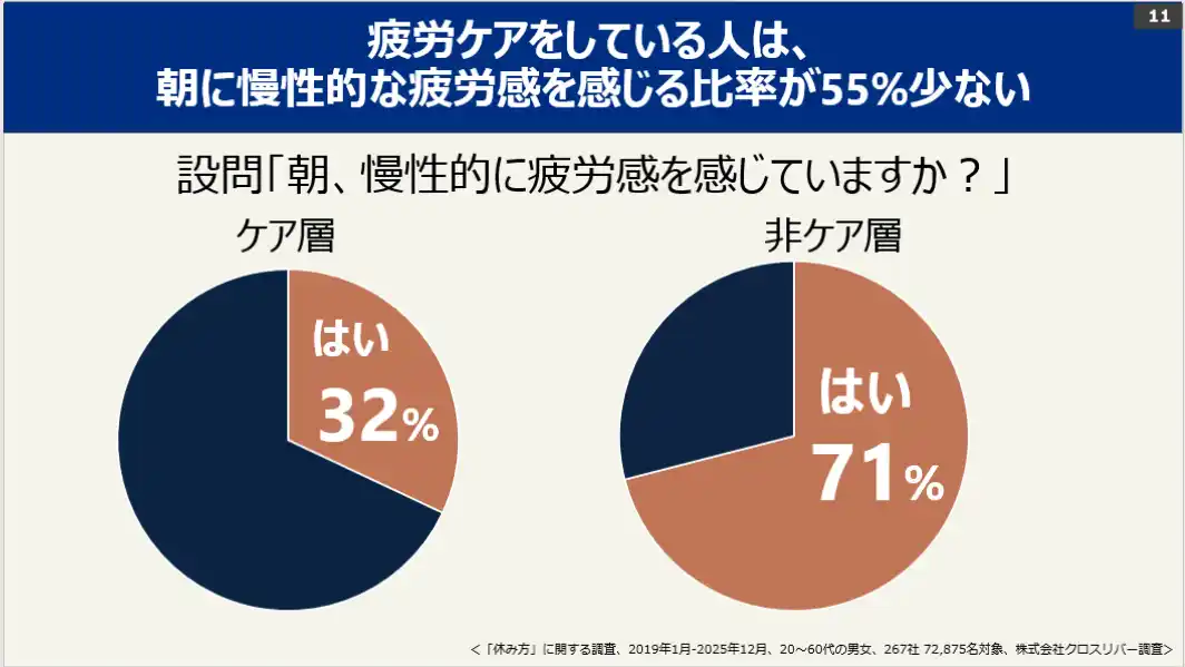 ・週4回以上の疲労ケア習慣がある人は、朝の疲労感が55%少ない傾向にあります。 |
