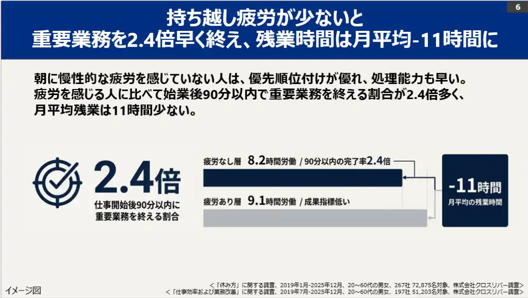 ・朝の持ち越し疲労がない人は、午前中の集中継続時間が1.5倍長く、タスク完了数が23%増加します。 |