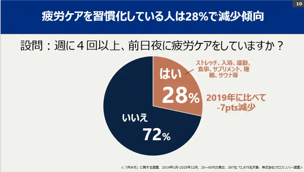 これほど効果があるにもかかわらず、週4回以上の疲労ケアを習慣化できている人は全体のわずか28%にとどまりました。 |