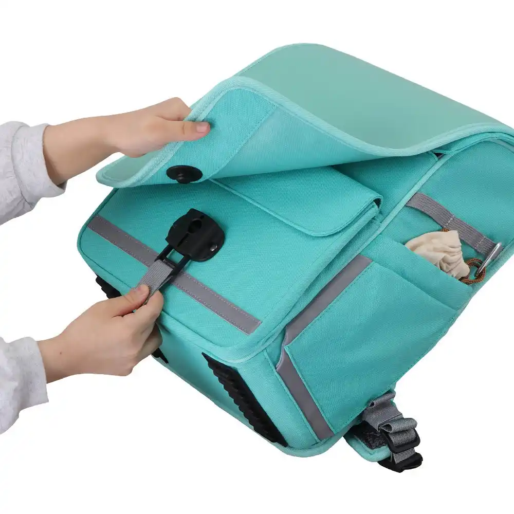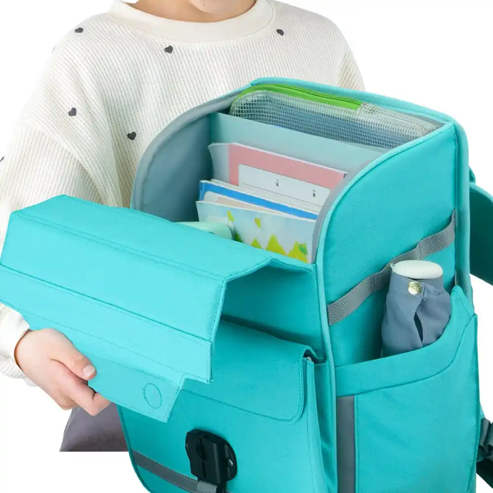 ファスナーを使わず磁石で開閉。カブセ(フラップ)を持ち上げるだけで中身を出し入れできます。強度の最適化を繰り返し、「簡単に開く」と「しっかり閉まる」の両立を実現。指先の力が弱くても、細かい動きが苦手な子でも、ワンアクションで開閉できます。 |