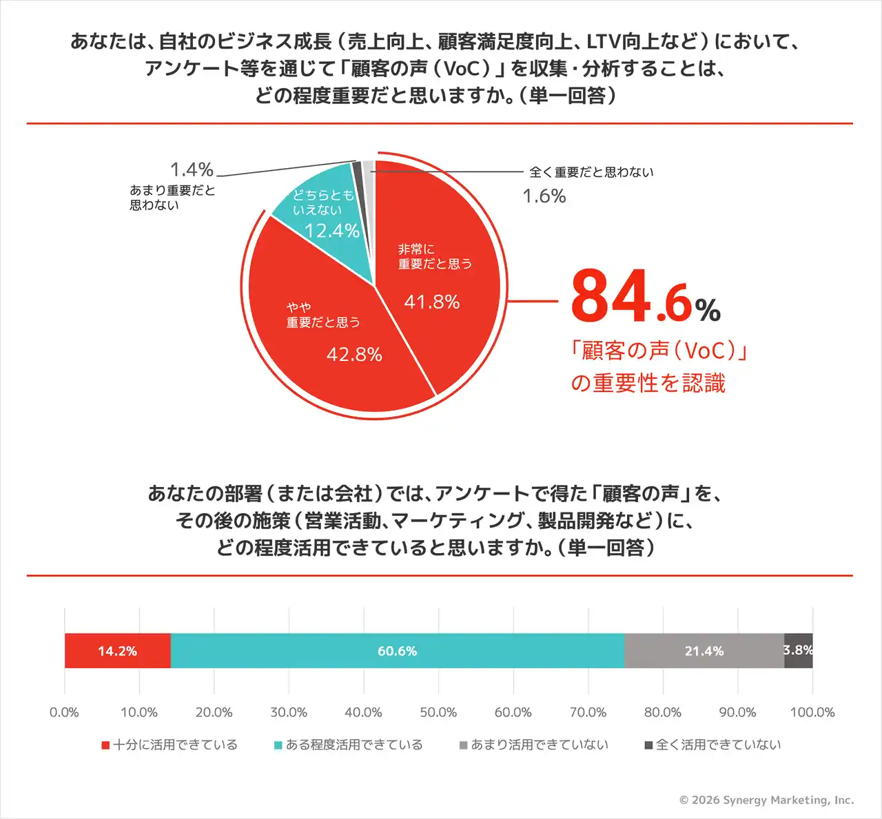一方で、アンケートで得た顧客の声をその後の施策に「十分に活用できている」と回答した層は14.2%にとどまりました。重要性の認識は高いものの、実際の活用には大きな隔たりがあることがわかります。 |