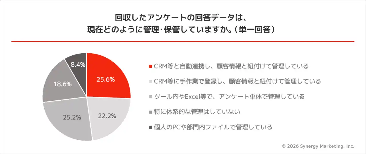 回収したアンケート回答データを、CRM等と自動連携し、顧客情報と紐付けて管理している企業は25.6%にとどまりました。 |