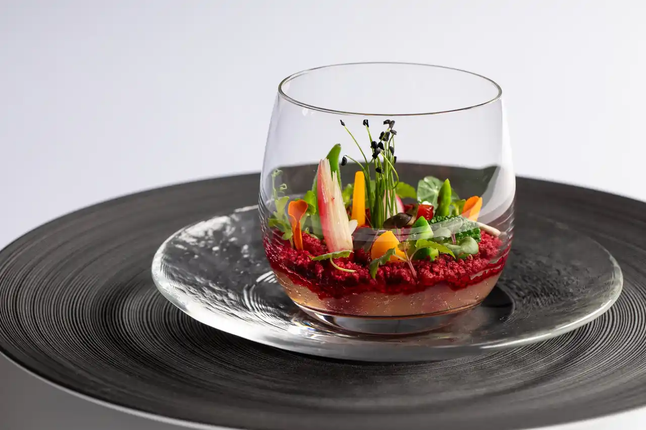 茶葉や山菜をはじめとした春野菜、糠漬け野菜を用いてコンソメにしたガスパチョ を五味・五法・五色を用いて多様な表情を引き出します。 |