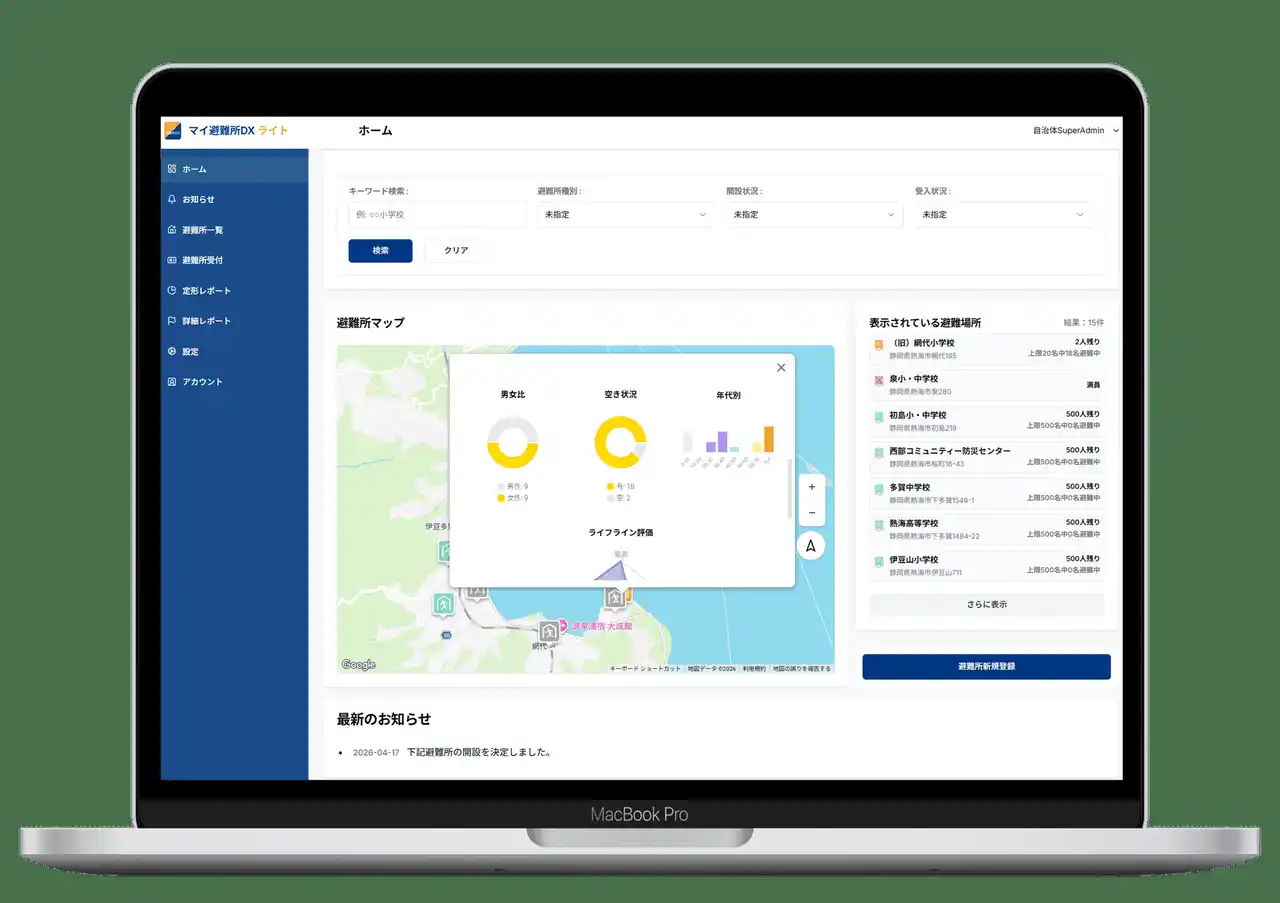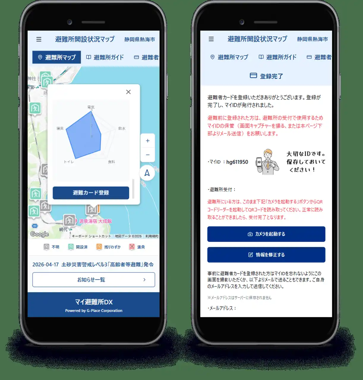 自治体向けの業務支援を行う株式会社G-Place(本社:京都府長岡京市、代表取締役社長:綾部英寿、以下「当社」)の公共イノベーション事業グループは、個人情報管理不要で避難所の管理運営のデジタル化を可能にする避難所管理システム「マイ避難所DXライト」を開発いたしました。開発完了を受け、全国の自治体が1ヶ月(延長については応相談)のあいだ実際の操作を確認できる「デモ版」を、2026年4月27日(月)に提供開始いたします。 |