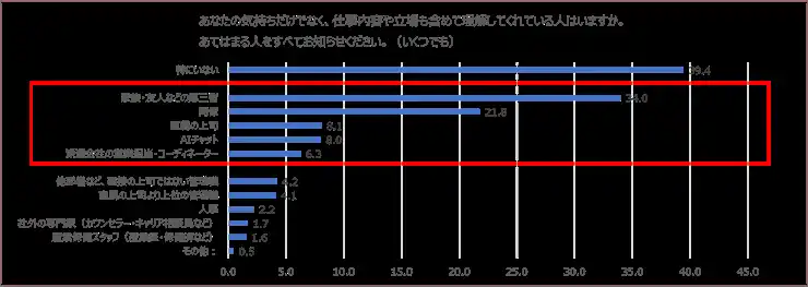 また、気持ちや立場を理解してくれる存在としては、約4割が「特にいない」と回答する一方、理解してくれる存在がいると回答した方の中では、「家族・友人などの第三者」(34.0%)が最も多く、次いで「同僚」(21.8%)、「直属の上司」(8.1%)となりました。社内の人(上司や管理職、同僚、人事など)よりも、利害関係がなく話しやすい関係性がある第三者に相談する人が多い傾向があることがわかりました。 |