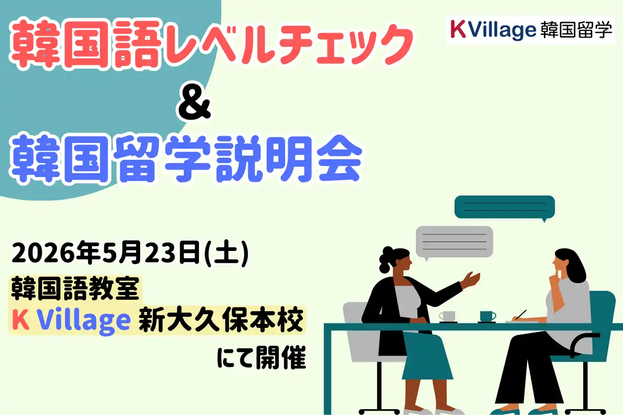 日本最大級の韓国語教室「K Village 韓国語」を運営する株式会社K Village(本社:東京都新宿区、代表取締役社長:桑原 元就)は、韓国語学習者の韓国留学への一歩を後押しすることを目的に、韓国人スタッフによるレベルチェックと留学カウンセラーによる説明会を実施します。 |