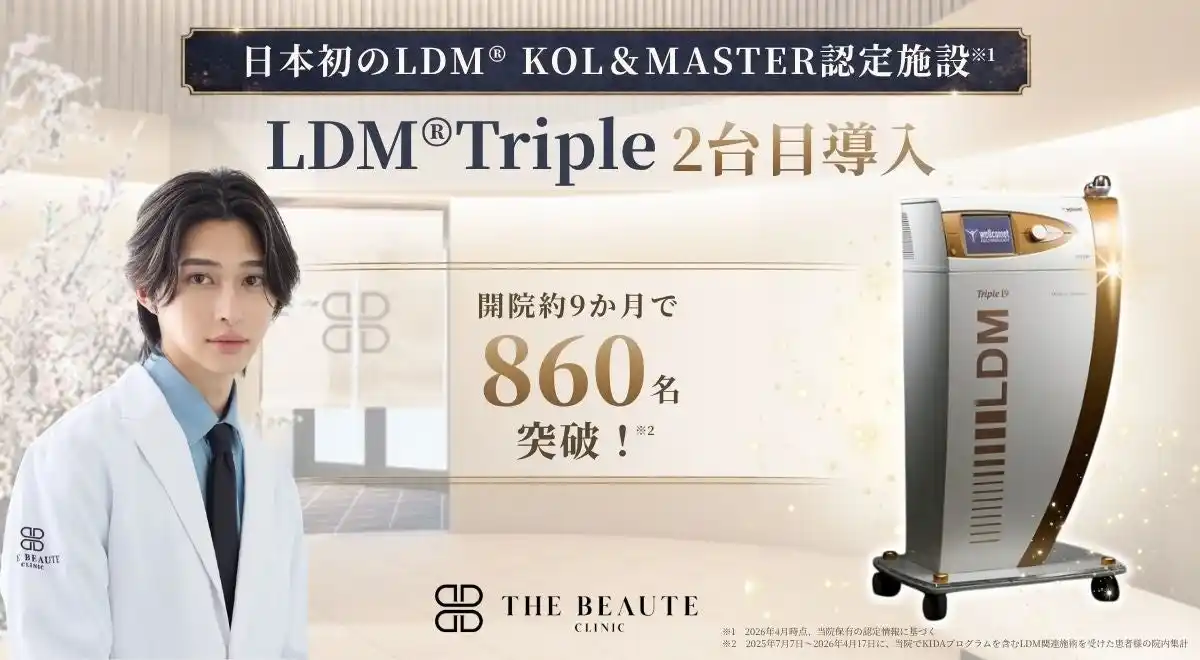 | 日本初のLDM(R) KOL&MASTER認定施設*¹ THE BEAUTE CLINIC、KIDAプログラム大好評で「LDM(R) Triple」2台目導入決定!開院約9か月で累計860名*² 突破 |