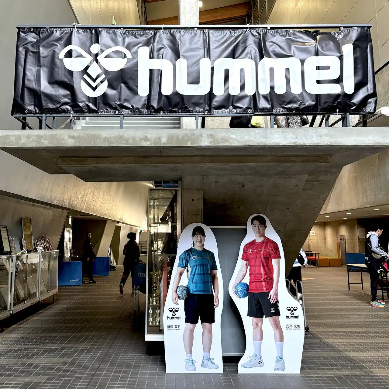 | さらに今年は、春中ハンド優勝経験のある安平光佑選手と相澤菜月選手の等身大パネルを設置、ヒュンメル契約選手の部井久アダム勇樹選手とグレイクレアフランシス選手を含めた4名に学生時代に意識していたことなどをインタビュー。ハンドボールを頑張る学生たちへエールを送った。 | ||||||||||||||||||||||||