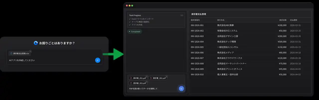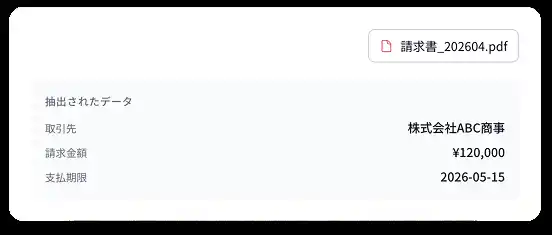 請求書・発注書・領収書などのPDFファイルをチャットに添付するだけで、AIエージェントが取引先・金額・日付などの項目を自動で読み取り、アプリへの登録まで一気に完遂します。複数のPDFをまとめて添付すれば一括処理も可能です。手入力による転記作業と入力ミスをゼロに近づけます。 |