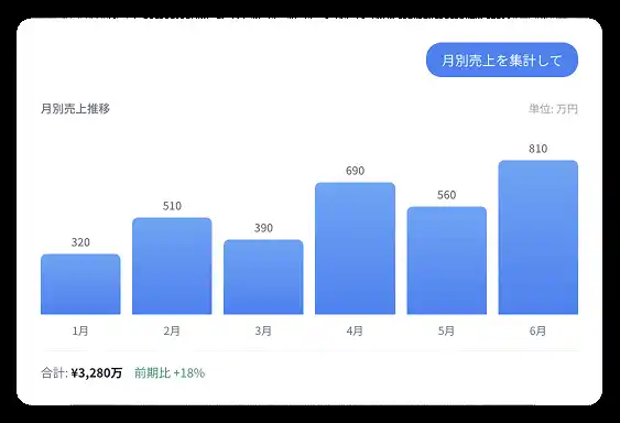 「月別売上を集計して」「今月の担当別受注成績を並べて」とチャットに送信するだけで、AIエージェントがデータの分析・集計をその場で実行します。関数やピボットテーブルの知識は不要で、必要な切り口でのグラフ化・数値化まで自動で対応します。経営会議や営業報告の準備にかかる時間を大幅に短縮できます。 |