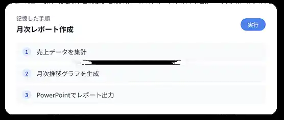 データの登録・集計・レポート作成など、AIエージェントが一度実行した手順を記憶します。次回以降はワンクリックで同じ手順を自動実行できるため、「毎月末に売上を集計してPowerPointにまとめる」といった定期業務を完全に自動化できます。覚えさせる手順に制限はなく、業務の数だけ自動化が広がります。 |