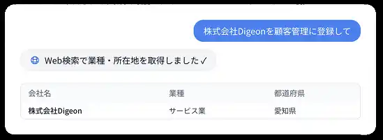 「株式会社〇〇を顧客管理に登録して」とチャットに送信するだけで、AIエージェントがアプリにデータを自動作成します。会社名を入力するだけでWeb検索と連携して業種・所在地・連絡先などの情報を自動補完するため、一件ごとに手入力する手間がありません。これまでExcelに手作業で行を追加していた作業が、チャット一文で完結します。 |