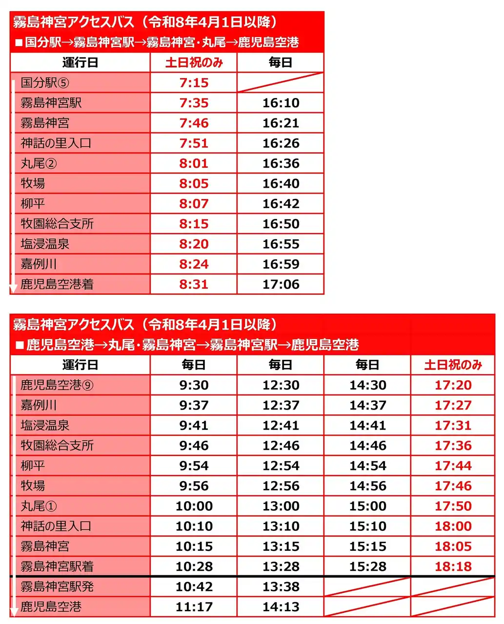 鹿児島空港9時00分発(丸尾(霧島温泉郷)~霧島神宮経由)霧島神宮駅行きを、9時30分発へ変更しました。 |