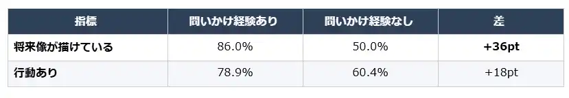 行動の有無と最も強い関連を示したのは、将来像の明確度でした。 |