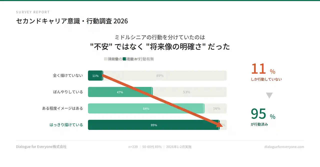 Dialogue for Everyone株式会社(本社:東京都、代表取締役:大桃綾子)は、50代を中心とするミドルシニア層239名を対象に「セカンドキャリア意識・行動調査2026」を実施しました。 |