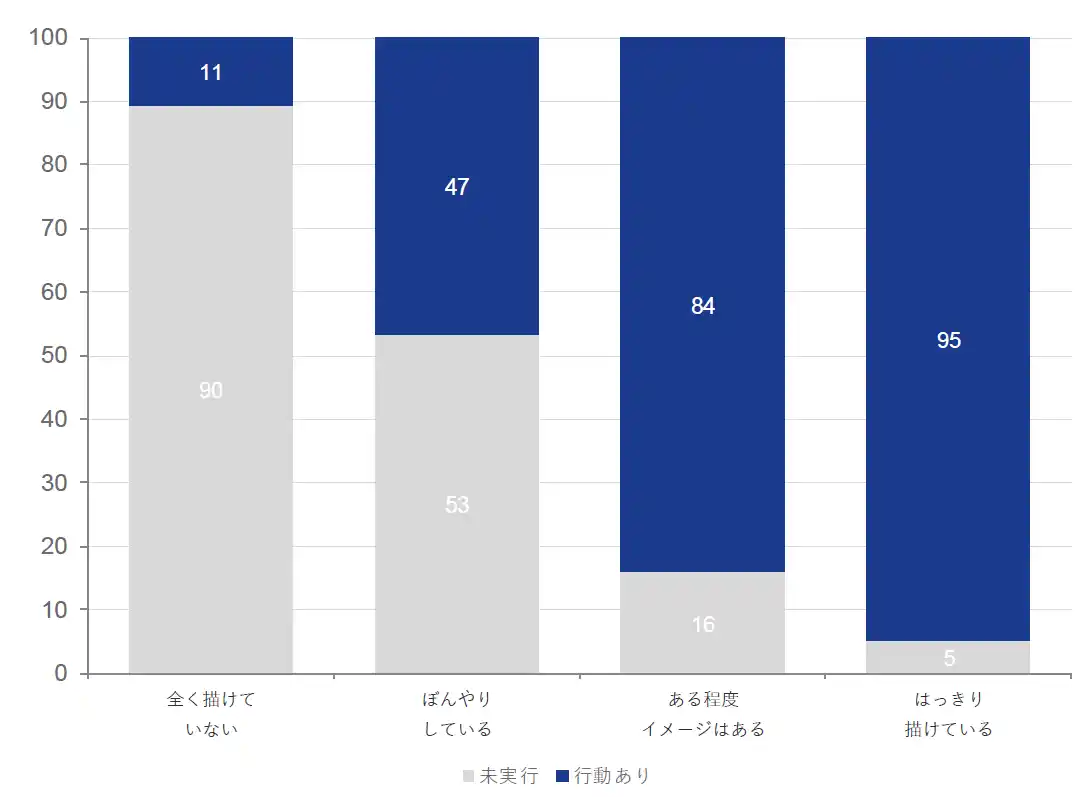 将来像が全く描けていない層では約9割が未行動にとどまり、はっきり描けている層では95%がすでに行動しています。 |