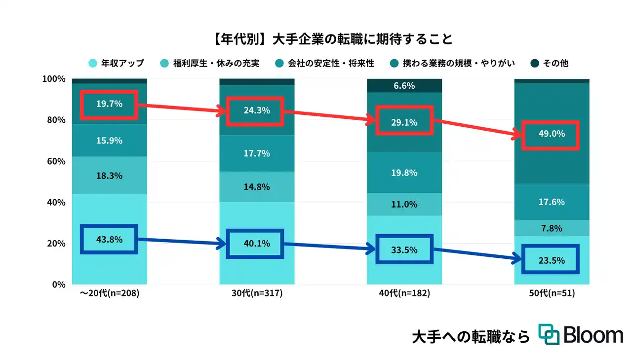 若年層ほど”年収アップ”を、年代を重ねると”携わる業務の規模・やりがい”を期待 |