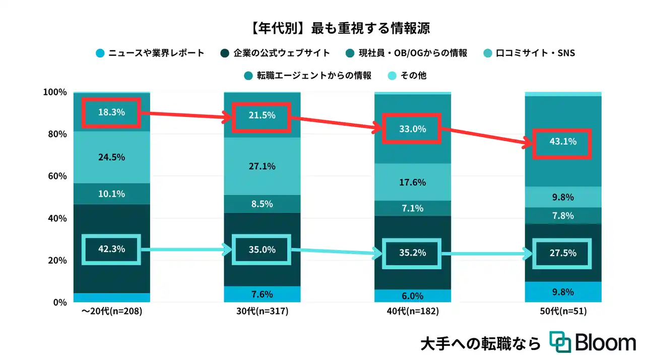 転職活動の情報収集において最も重視する情報源:20代は「企業の公式ウェブサイト(42.3%)」で「口コミサイト・SNS(24.5%)」を上回る結果に。50代は「転職エージェントからの情報(43.1%)」と、若年世代ほど企業が発信する一次情報メディアを重視する結果に。 |